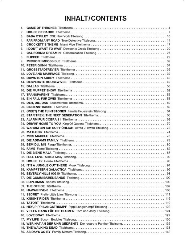 Television classics are almost more remembered for their fantastic theme songs than for their content. Almost anyone can immediately recognise and sing along to the famous title themes. This songbook collects 50 of the best TV hits and arranges them for Piano, Voice and Guitar, so that musicians of all ages can learn and play the tunes themselves. The selection is based on popularity and playability. From Dallas of 1970 to the massive hits of the 2010s in Game of Thrones and The Walking Dead, these hits include something for everyone. 50 Titelsongs und Themen aus bekannten TV-Serien Game Of Thrones House Of Cards Baba O'Riley (CSI: New York) Far From Any Road (True Detective) Crockett's Theme (Miami Vice) I Don't Want To Wait (Dawson's Creek) California Dreamin' (Californication) Flipper Mission: Impossible Peter Gunn Großstadtrevier Love And Marriage (Eine schrecklich nette Familie) Downton Abbey Desperate Housewives Dallas Die Muppet Show Transparent Ein Fall für Zwei Der, Die, Das (Sesamstraße) Lindenstraße (Meet) The Flintstones (Familie Feuerstein) Star Trek: The Next Generation Alarm für Cobra 11 Drivin' Home To You (King Of Queens) Warum bin ich so fröhlich (Alfred J. Kwak) Matlock Miss Marple Die Addams Family Bemidji, MN (Fargo) Fame Die Biene Maja I See Love (Mike and Molly) House (Dr. House) It's A Jungle Out There (Monk) Kampfstern Galactica Beverly Hills 90210 Die Gummibärenbande Superman (Scrubs) The Office (US) Hawaii Five-O Secret (Pretty Little Liars) Knight Rider Tatort Hey, Pippi Langstrumpf (Pippi Langstrumpf) Vielen Dank für die Blumen (Tom und Jerry) Love Boat My Life (Bossom Buddies) Wer hat an der Uhr gedreht? (Der rosarote Panther) The Walking Dead As Days Go By (Family Matters)