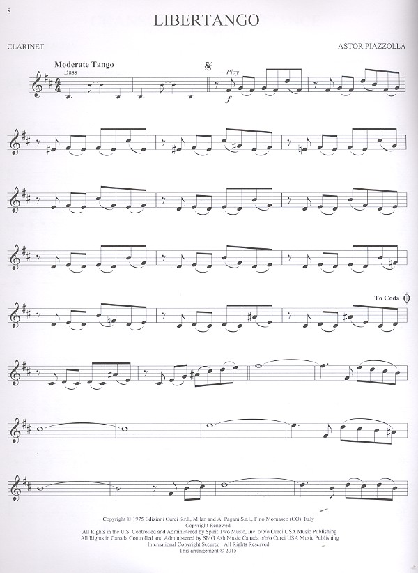 Instrumental Playalong 14 Solo Arrangements Ausencias (The Absent) El viaje (The Voyage) Chanson de la naissance (Song of the Birth) Libertango Los sueños (Dreams) Milonga Oblivion Ouverture from Famille d'artistes Sensuel (Sensual) Sentimental Sin rumbo (Aimless) Street Tango Tango final Vuelvo al sur (I'm Returning South)