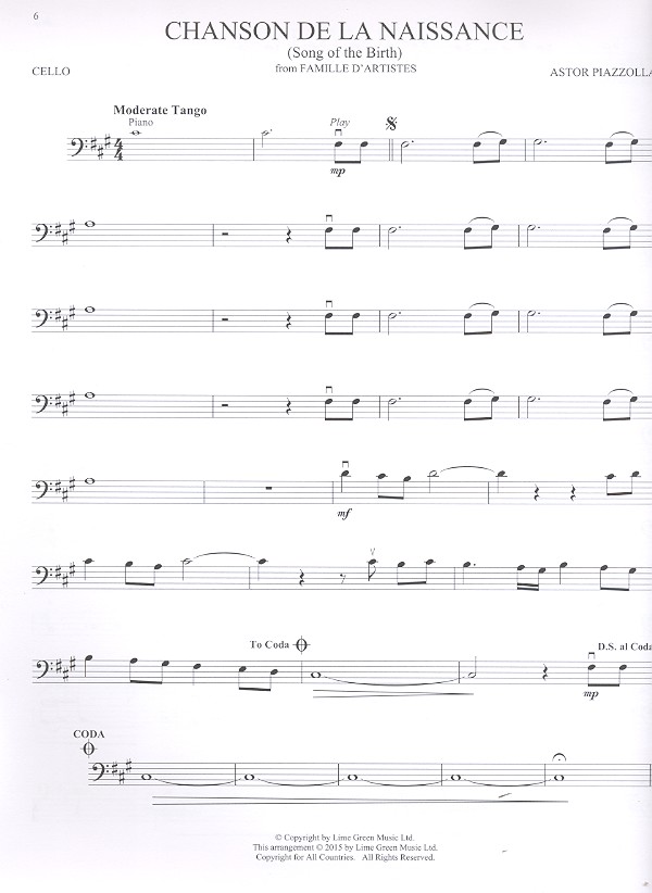 Instrumental Playalong 14 Solo Arrangements Ausencias (The Absent) El viaje (The Voyage) Chanson de la naissance (Song of the Birth) Libertango Los sueños (Dreams) Milonga Oblivion Ouverture from Famille d'artistes Sensuel (Sensual) Sentimental Sin rumbo (Aimless) Street Tango Tango final Vuelvo al sur (I'm Returning South)