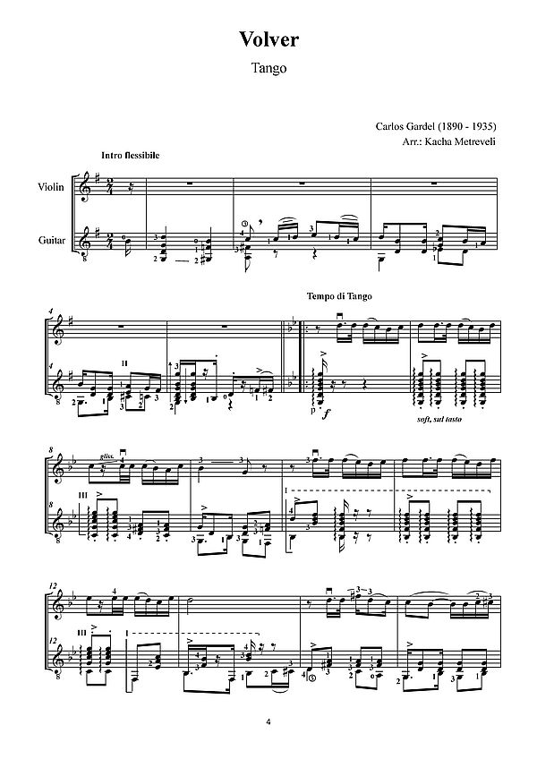 Der gebürtige Argentinier Carlos Gardel (1890 - 1935) gehört wegen seines stilbildenden Einflusses zu den wichtigen Persönlichkeiten des Tangos. Erfolgreich als Sänger, Orchesterleiter und Filmschauspieler verhalf er dem Tango zu kommerziellem Erfolg weit über die Grenzen Argentiniens hinaus. Kacha Metreveli hat mit ?Volver?, ?Por una cabeza? und ?Melodía de arrabal? drei besonders reizvolle Stücke aufgegriffen und diese für Violine und Gitarre arrangiert. Die vorliegende Ausgabe umfasst Partitur und Einzelstimmen. Inhalt: Volver Por una cabeza Melodía de arrabal
