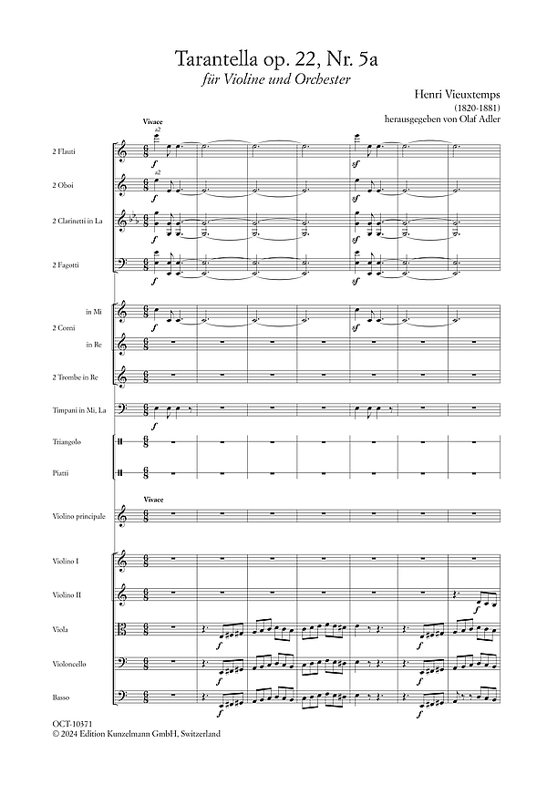 Die Tarantella op. 22, Nr. 5 des belgischen Violinvirtuosen und Komponisten Henri Vieuxtemps gehört zu den Standardwerken der Violinliteratur. Sie ist häufiger Bestandteil von Wettbewerbs- und Konzertprogrammen, es existieren eine Reihe von Einspielungen. Bislang noch kaum bekannt ist jedoch, dass Vieuxtemps von diesem Werk auch eine stark überarbeitete Version für Violine und Orchester verfasste, die hiermit erstmals vollständig veröffentlicht wird.