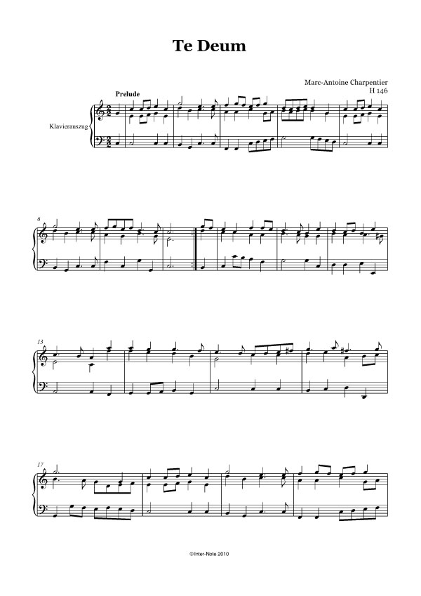 Das Te Deum in D-Dur (H. 146) ist wohl das bekannteste Werk von Marc-Antoine Charpentier. Es ist ein Grand Motet, eine Sonderform der Motette für Soli, Chor und Orchester, die am Hof von Ludwig XIV. entwickelt wurde. Er komponierte dieses Te Deum gegen Ende des 17. Jahrhunderts, als er Kapellmeister an der Kirche Saint-Louis der Jesuiten in Paris war. Charpentier hat den Text des Te Deum vermutlich sechsmal vertont, davon sind vier Werke erhalten geblieben. H. 146 ist allerdings Charpentiers einziges Te Deum mit Pauken und Trompeten. Seine Bekanntheit verdankt es der Tatsache, dass die ersten acht Takte des Präludiums als Erkennungsmelodie der Eurovision verwendet werden. Die vorliegende Neuausgabe beruht auf den verfügbaren historische Ausgaben. Nach dem Prinzip des ?Living Urtext? sorgt das ständige Feedback der mit unseren Ausgaben arbeitenden Künstler dafür, dass die Präzision des Textes immer mehr verfeinert wird und Fehler und Ungenauigkeiten auf diese Weise ständig korrigiert werden können.