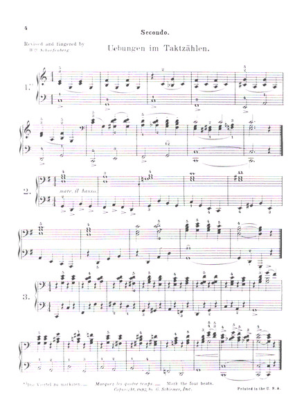 Schirmer's Library of Musical Classics vol.472 A Practical Course of Four-Hand Piano Playing Aria (Don Juan) Mozart Aria (Weber) Aria (L'elisir D'amore) Bohemian Dance Bohemian Song Choral Chorus (Magic Flute) Mozart Chorus Of Huntsmen (Freischutz) Cossack Dance Duet (Merry Wives Of Windsor) Evening Fandango German Waltz German Song, Op. 39, No. 17 God Save Our King (Queen) Good Humor Hungarian Dance Hunter's Song In Springtime Italian Dance March-Impromptu The Mermaid's Song Morning Prayer (Freischutz) Russian Dance (Trepak), Op. 71a Russian Hymn Scherzo Servian Melody Solemn March Te Deum Waltz, Op. 39, No. 8