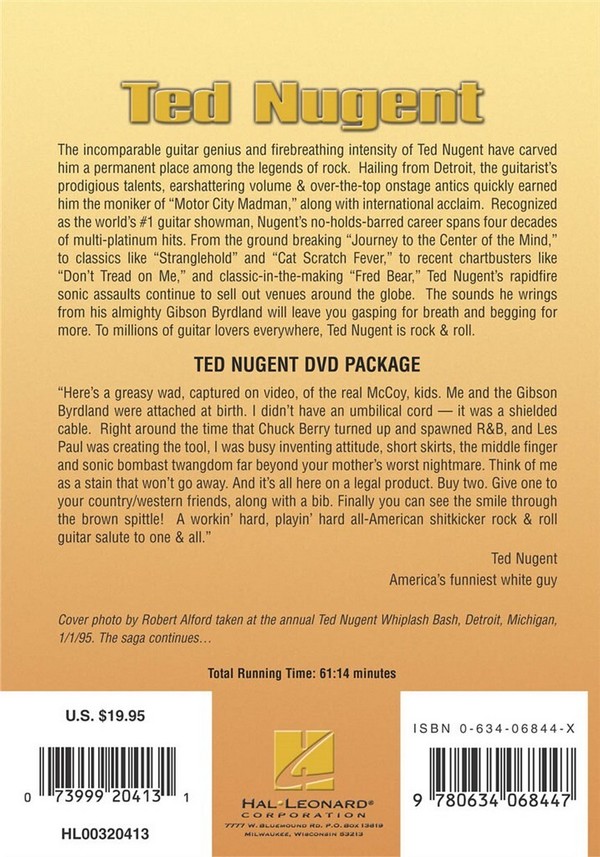 The incomparable guitar genius and firebreathing intensity of Ted Nugent have carved him a permanent place among the legends of rock. Hailing from Detroit, his prodigious talents, earshattering volume & over-the-top onstage anticsquickly earned him the moniker of Motor City Madman, along with international acclaim. Recognized as the world's #1 guitar showman, Nugent's no-holds-barred career spans four decades of multi-platinum hits. From thegroundbreaking Journey to the Center of the Mind, to classics like Stranglehold and Cat Scratch Fever, to recent chartbusters like Don't Tread on Me, andclassic-in-the-making Fred Bear, Ted Nugent's rapidfire sonic assaults continue to sell out venues around the globe. The sounds he wrings from his almighty Gibson Byrdland will leave you gasping for breath andbegging for more! 61 minutes.