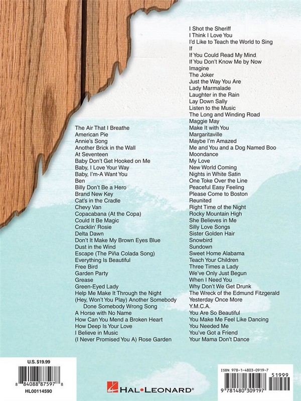 1. The Air That I Breathe 2. Chevy Van 3. If 4. Rocky Mountain High 6. American Pie 7. Sundown 8. Annie's song 9. Another Brick In The Wall 10. (Hey, Won't You Play) Another Somebody Done Somebody Wrong Song 11. The Joker 12. Sister Golden Hair 13. At Seventeen 14. Imagine 15. Baby Don't Get Hooked On Me 16. By by, I Love Your Way 17. Baby, I'm-A Want You 18. My Love 19. I Think I Love You 20. Ben 21. Brand New Key 22. Everything Is Beautiful 23. Copacabana (At The Copa) 24. Could It Be Magic 25. Cracklin' Rosie 26. Delta Dawn 27. Don't It Make My Brown Eyes Blue 28. Just the way you are 29. Dust in the Wind 30. Silly Love Songs 31. Escape (The Pina Colada Song) 32. Billy Don't Be A Hero 33. Free Bird 34. Garden Party 35. Grease 36. Green-Eyed Lady 37. Help Me Make It Through The Night 38. A Horse With No Name 39. How Can You Mend A Broken Heart 40. How deep is your love 41. I Believe In Music 42. I Shot the Sheriff 43. I'D Like To Teach The World To Sing 44. If You Could Read My Mind 45. Laughter in the rain 46. Lay Down Sally 47. Listen To The Music 48. The Long and Winding Road 49. Maggie May 50. Make It With You 51. Margaritaville 52. Maybe I'm Amazed 53. Me And You And A Dog Named Boo 54. Moondance 55. New World Coming 56. Nights in white satin 57. One Toke Over The Line 58. Peaceful Easy Feeling 59. Please Come To Boston 60. Reunited 61. Right Time Of The Night 62. (I Never Promised You A) Rose Garden 63. She Believes In Me 64. Snowbird 65. Sweet Home Alabama 66. Teach Your Children 67. Three Times a Lady 68. We'Ve Only Just Begun 69. When I need you 70. Why Don't We Get Drunk 71. Cat's In The Cradle 72. If You Don't Know Me By Now 73. The Wreck Of The Edmund Fitzgerald 74. Y.M.C.A. 75. Yesterday once more 76. You are so beautiful 77. You needed Me 78. You'Ve Got A Friend 79. Your Mama Don't Dance 80. You Make Me Feel Like Dancing