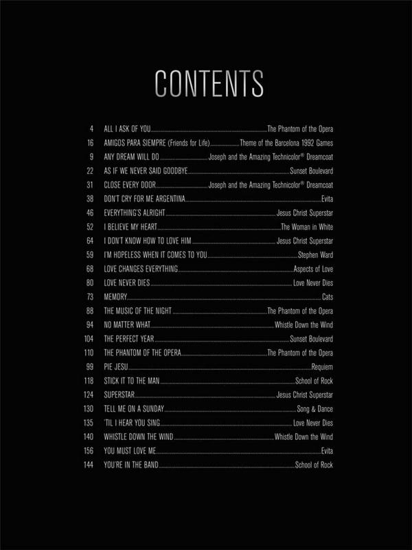 25 of his greatest Songs All I Ask Of You (from THE PHANTOM OF THE OPERA) Amigos Para Siempre (Friends For Life) ((The Official Theme Of The Barcelona 1992 Games)) Any Dream Will Do (from JOSEPH AND THE AMAZING TECHNICOLOR«DREAMCOAT) As If We Never Said Goodbye (from SUNSET BOULEVARD) Close Every Door (from JOSEPH AND THE AMAZING TECHNICOLOR« DREAMCOAT) Don't Cry For Me Argentina (from EVITA) Everything's Alright (from JESUS CHRIST SUPERSTAR) I Believe My Heart (from THE WOMAN IN WHITE) I Don't Know How To Love Him (from JESUS CHRIST SUPERSTAR) I'm Hopeless When It Comes To You (from STEPHEN WARD) Love Changes Everything (from ASPECTS OF LOVE) Love Never Dies (from LOVE NEVER DIES) Memory (from CATS) The Music Of The Night (from THE PHANTOM OF THE OPERA) No Matter What (from WHISTLE DOWN THE WIND) The Perfect Year (from SUNSET BOULEVARD) The Phantom Of The Opera (from THE PHANTOM OF THE OPERA) Pie Jesu (from REQUIEM) Stick It To The Man (from SCHOOL OF ROCK) Superstar (from JESUS CHRIST SUPERSTAR) Tell Me On A Sunday (from SONG & DANCE) 'Til I Hear You Sing (from LOVE NEVER DIES) Whistle Down The Wind (from WHISTLE DOWN THE WIND) You Must Love Me (from the Cinergi Motion Picture EVITA) You're In The Band (from SCHOOL OF ROCK)
