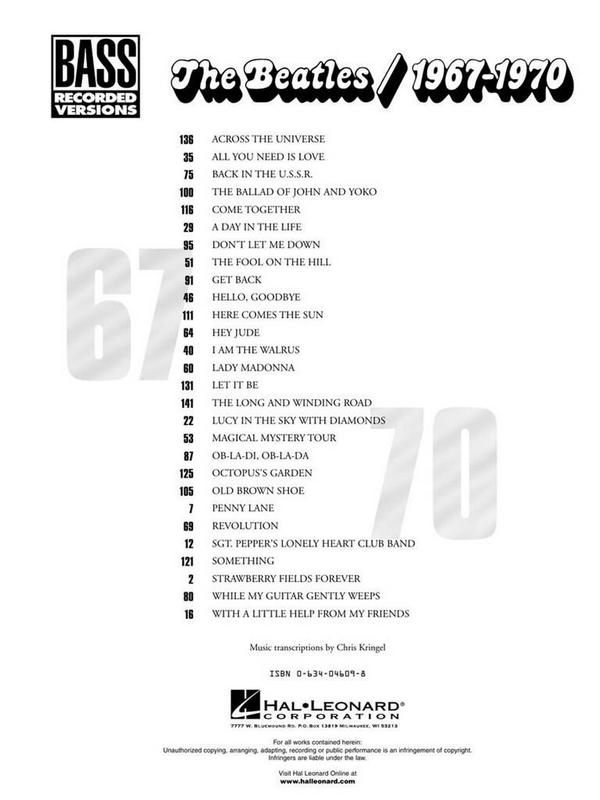 Strawberry fields forever Penny Lane Sgt. Pepper's lonely hearts club band With a little help Lucy in the sky A day in the life All you need is love I am the walrus Hello goodbye The fool on the hill Magical mystery tour Lady Madonna Hey Jude Revolution Back in the USSR While my guitar gently weeps Ob-la-di, Ob-la-da Get back Don't let me down The ballad of John and Yoko Old brown shoe Here comes the sun Come together Something Octopus's garden Let it be Across the universe The long and winding road