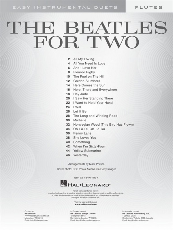 Easy Instrumental Duets Phillips, Mark, arr. The Beatles, Interpret All My Loving All You Need Is Love And I Love Her Eleanor Rigby The Fool On The Hill Golden Slumbers Here Comes The Sun Here, There And Everywhere Hey Jude I Saw Her Standing There I Want To Hold Your Hand I Will Let It Be The Long And Winding Road Michelle Norwegian Wood (This Bird Has Flown) Ob-La-Di, Ob-La-Da Penny Lane She Loves You Something When I'm Sixty-Four Yellow Submarine Yesterday