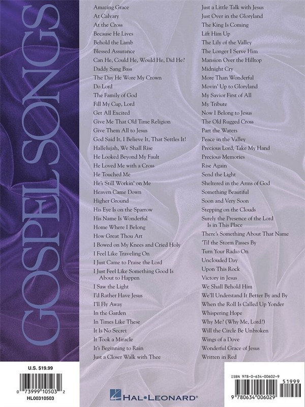 Amazing Grace At Calvary At The Cross Because He Lives Behold The Lamb Blessed Assurance Can He, Could He, Would He, Did He? Daddy Sang Bass Do Lord Fill My Cup, Lord Get All Excited Give Me That Old Time Religion Give Them All To Jesus God Said It, I Believe It, That Settles It! Hallelujah, We Shall Rise He Looked Beyond My Fault He Loved Me With A Cross He Touched Me He's Still Workin' On Me Heaven Came Down Higher Ground His Eye Is On The Sparrow His Name Is Wonderful Home Where I Belong How Great Thou Art I Bowed On My Knees And Cried Holy I Feel Like Traveling On I Just Came To Praise The Lord I Just Feel Like Something Good Is About To Happen I Saw The Light I'd Rather Have Jesus I'll Fly Away In The Garden In Times Like These It Is No Secret (What God Can Do) It Took A Miracle It's Beginning To Rain Just A Closer Walk With Thee Just A Little Talk With Jesus Just Over In The Gloryland Lift Him Up The Lily Of The Valley Mansion Over The Hilltop Midnight Cry More Than Wonderful Movin' Up To Gloryland My Savior First Of All My Tribute Now I Belong To Jesus Part The Waters (There'll Be) Peace In The Valley (For Me) Precious Lord, Take My Hand (Take My Hand, Precious Lord) Precious Memories Rise Again Send The Light Sheltered In The Arms Of God Something Beautiful Soon And Very Soon Stepping On The Clouds Surely The Presence Of The Lord Is In This Place The Day He Wore My Crown The Family Of God The King Is Coming The Longer I Serve Him The Old Rugged Cross The Unclouded Day There's Something About That Name 'Til The Storm Passes By Turn Your Radio On Upon This Rock Victory In Jesus We Shall Behold Him We'll Understand It Better By And By When The Roll Is Called Up Yonder Whispering Hope Why Me? (Why Me, Lord?) Will The Circle Be Unbroken Wings Of A Dove Wonderful Grace Of Jesus Written In Red