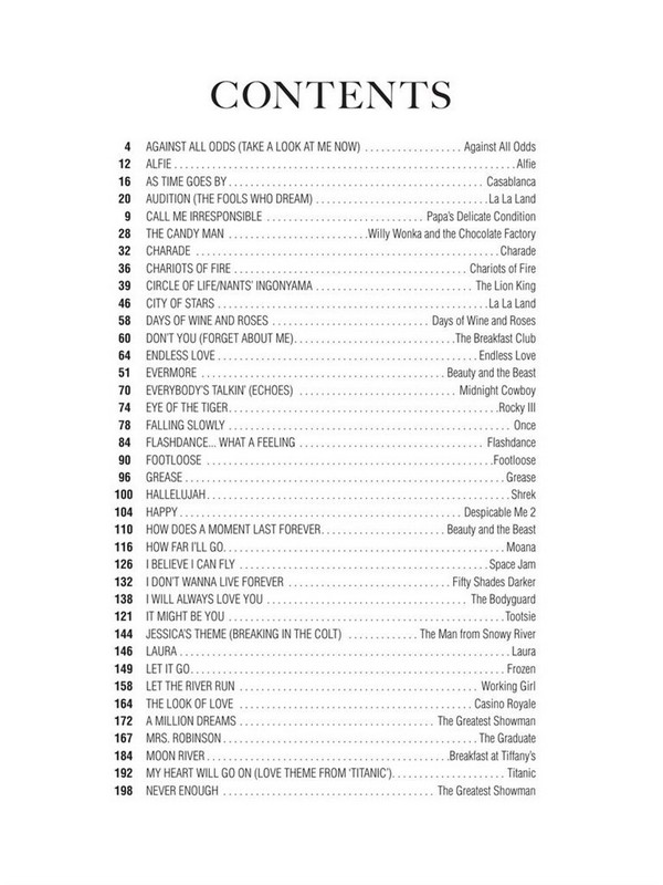 1. Happy 2. You light up my life 3. Somewhere 4. Let it Go 5. Hallelujah 6. Secret Love 7. Never enough 8. As Time Goes By 9. This is Me 10. The Power of Love 11. Time Warp 12. Charade 13. Falling Slowly 14. Days of Wine and Roses 15. Don'T You (Forget About Me) 16. Nants' Ingonyama 17. Skyfall 18. Eye of the Tiger 19. Footloose 20. How Far I'Ll Go 21. You're Welcome 22. I Don't Wanna Live Forever (Fifty Shades Darker) 23. City Of Stars 24. Audition (The Fools Who Dream) 25. Someone In The Crowd 26. Evermore 27. How Does A Moment Last Forever 28. A Million Dreams 29. Remember Me (Ernesto de la Cruz) 30. Grease 31. Shallow 32. The Place Where Lost Things Go 33. I will always love you 34. It Might Be You 35. Laura 36. Mrs. Robinson 37. Theme From 'New York, New York' 38. Over the Rainbow 39. Singin' in the rain 40. Stayin' Alive 41. The Trolley Song 42. When you wish upon a star 43. The Wind Beneath My Wings 44. The Windmills of Your Mind 45. You'Re The One That I Want