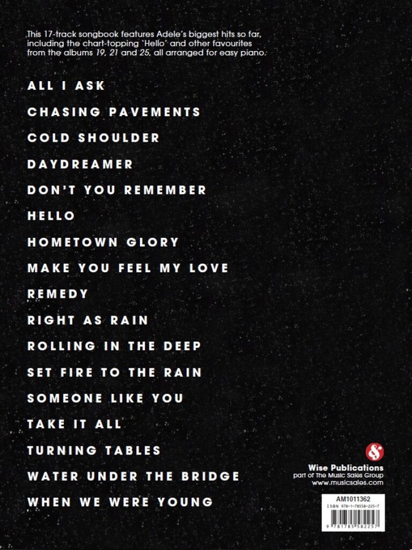 replacement for AM1003508 17 Hit Songs All I ask Chasing Pavements Cold Shoulder Daydreamer Don't You remember Hello Hometown Glory Make You feel my Love Remedy Right as Rain Roling in the Deep Set Fire to the Rain Someone like You Take it all Turning Tables Water under the Bridge When we were young