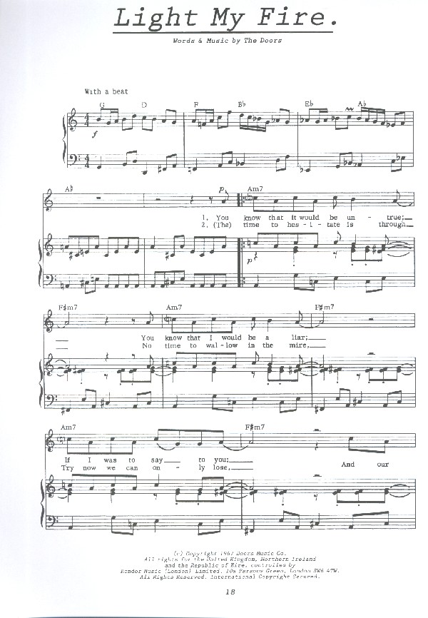 Been down so long Cars hiss my Window Changeling Crystal Ship The End Five to One Hello, I love you L. A. Woman Light my Fire Love her madly Love Street Not to touch the Earth People are strange Riders on the Storm Soul Kitchen Strange Days Twentieth Century Fox The unknown Soldier The Wasp When the Music's over