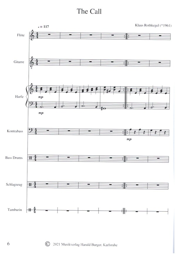 | Untertitel: | für Flöte, Gitarrre, Harfe (Klavier), Kontrabass und Percussion Partitur und Stimmen |