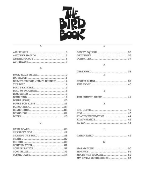 Yamaguchi, Masaya, arr. and ed Ah-Leu-Cha Another Hairdo Anthropology Au Privave Back Home Blues Barbados Billie's Bounce The Bird Bird Feathers Bird of Paradise Bloomdido Blue Bird Blues (fast) Blues for Alice Bongo Beep Bongo Bird Bongo Bop Buzzy Card Board Charlie's Wig Chasing the Bird Cheryl Chi chi Confirmation Constellation Cool Blues Cosmic Rays Dewey Square Dexterity Donna Lee Gerrybird Hootie Blues The Hymn The Jumpin' Blues K.C. Blues Kim Klactoueededstine Klaunstance Ko Ko Laird Baird Marmaduke Mohawk Moose the Mooche My little Suede Shoes Now's the Time Ornithology An Oscar for Treadwell Parker's Mood Passport Perhaps Quasimodo Red Cross Relaxin' at the Camarillo Scapple from the Apple Segment Shawnuff She rote Si si STepplechase Tail Feathers Visa Yardbird Suite