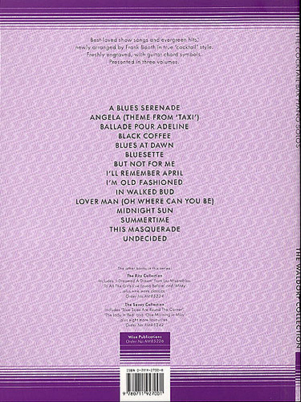 Barmusik Waldorf Walldorf Black coffee Blues at dawn Bluesette But not for me I'll remember april I'm old fashioned In walked bud Lover man Midnight sun Summertime This masquerade Undecided Ballade pour Adeline Blues serenade The Waldorf Collection