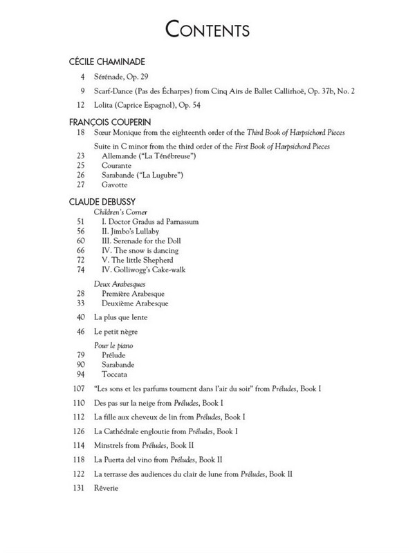 Schirmer's Library of musical Classics vol.2118 48 Pieces Allemande (La Tenebreuse), Suite In C Minor (from THE THIRD ORDER OF THE FIRST BOOK OF HARPSICHORD PIECES) Anime, Sonatine Arabesque no.1 (from TWO ARABESQUES) Arabesque no.2 (from TWO ARABESQUES) Berceuse In E Major op.56,1 Clair De Lune (from SUITE BERGAMASQUE) Courante, Suite In C Minor (from THE THIRD ORDER OF THE FIRST BOOK OF HARPSICHORD PIECES) Des Pas Sur La Neige (Footprints In The Snow) (from PRELUDES, BOOK 1) Doctor Gradus Ad Parnassum (from CHILDREN'S CORNER) Gavotte, Suite In C Minor (from THE THIRD ORDER OF THE FIRST BOOK OF HARPSICHORD PIECES) Gnossienne no.1 (from THREE GNOSSIENNES) Gnossienne no.3 (from THREE GNOSSIENNES) Gnossienne no.2 (from THREE GNOSSIENNES) Golliwogg's Cake Walk (from CHILDREN'S CORNER) Gymnopedie no.1 (from THREE GYMNOPEDIES) Gymnopedie no.3 (from THREE GYMNOPEDIES) Gymnopedie no.2 (from THREE GYMNOPEDIES) Impromptu In A-Flat Major op.34,3 Improvisation In C-Sharp Minor op.84,5 Jimbo's Lullaby (from CHILDREN'S CORNER) La Cathedrale Engloutie (from PRELUDES, BOOK 1) La Fille Aux Cheveux De Lin (The Girl With The Flaxen Hair) (from PRELUDES, BOOK 1) La Plus Que Lente La Puerta Del Vino (from PRELUDES, LIVRE II) La Terrasse Des Audiences Du Clair De Lune (from PRELUDES, LIVRE II) Le Petit Negre Les Sons Et Les Parfums Tournent Dans L'Air Du Soir (from PRELUDES, BOOK 1) The Little Shepherd (from CHILDREN'S CORNER) Lolita (Caprice Espagnol) op.54 Menuet (from SUITE BERGAMASQUE) Minuet On The Name Of Haydn Minstrels (from PRELUDES, BOOK 1) Modere, Sonatine Mouvement De Menuet, Sonatine Nocturne In E-Flat Major op.36,4 Passepied (from SUITE BERGAMASQUE) Pavane For A Dead Princess Prelude (from SUITE BERGAMASQUE) Prelude, Pour Le Piano (from POUR LE PIANO) Reverie Sarabande (La Lugubre), Suite In C Minor (from THE THIRD ORDER OF THE FIRST BOOK OF HARPSICHORD PIECES) Sarabande, Pour Le Piano (from POUR LE PIANO) Scarf-Dance op.37b,2 (from CINQ AIRS DE BALLET CALLIRHOE op.37B) Serenade For The Doll (from CHILDREN'S CORNER) Serenade op.29 The Snow Is Dancing (from CHILDREN'S CORNER) Soeur Monique, Third Book Of Harpsichord Pieces (from THE EIGHTEENTH ORDER OF THE THIRD BOOK OF HARPSICHORD PIECES) Toccata, Pour Le Piano (from POUR LE PIANO)