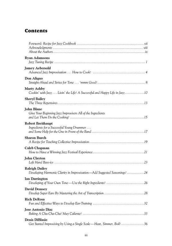 Meredith Music Resource A must have exciting collection of favorite tips from 57 of today's most outstanding educators, performers, and industry pros in the jazz education world. This is an ideal source that contains proven successful suggestions that will not only aid the teacher/director from junior high school to university levels, but the conductor and performer novice to professional! Performance tips on instrument technique, rehearsals, programming, technology, improvisation and much more! Enjoy this quick-to-read enjoyable book that will inform and inspire creativity and improvement at all levels. Sample recipes include: Jamey Abersold, legendary jazz educator and publisher, NEW Jazz Master and LeJENd of Jazz Education Honoree Advanced Jazz Improve, How to Cook! John Clayton, Grammy award winning Bassist and composer, JEN Vice-President Left Hand Bass-ics Dennis DiBlasio, jazz saxophonist with Maynard Ferguson and others, arranger, composer, educator Get Started Improvising by Using a Single Scale-Heat, Simmer, Boil! Diane Downs, founder and artistic director of the renowned Louisville Leopard Percussionists All About the Blues! Dr. Lou Fischer, co-founder/past president of the Jazz Education Network, performer, composer, author Big Band Shake 'n BakeSuccessful Performance Tips Dan Haerle, faculty/Regents professor in Jazz studies at the UNT 25 years, LeJENds of Jazz Education recipient Expand Your Palettea taste of Voicings Dave Liebman, NEA Jazz Master, LeJENd of Jazz Education, award winning performer, lecturer, author Beyond the MusicJazz Education in the Century of Change Darmon Meader, distinguished vocalist, arranger, and saxophonist, founder/performer New York Voices Stir, Don't ShakeRecipe for Vocal Improv Bob Mintzer, 23-year member of Yellowjackets, Grammy award-winning big band leader and composer of big band music performed globally Spice Up your Life with Musicwords from one who knows!