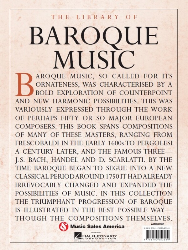 Sonata No.1 In F Major (Arne, Thomas) Italian Concerto BWV 971 (Bach, J.S.) Concerto For Two Violins (2nd Movement) (Bach, J.S.) Air On The G String (From Orchestral Suite No.3 In D Major) (Bach, J.S.) Aria (From The Goldberg Variations) (Bach, J.S.) Badinerie (from Orchestral Suite No.2 in B Minor) (Bach, J.S.) Brandenburg Concerto No.3 In G Major (1st Movement) (Bach, J.S.) Fantasia In C Minor (Bach, J.S.) Harpsichord Concerto No.5 In F Minor (1st Movement) (Bach, J.S.) In Tears Of Grief (From St. Matthew Passion) (Bach, J.S.) Jesu, Joy Of Man's Desiring (From Cantata No.147) (Bach, J.S.) Prelude And Fugue No.11 In F Major (From The Well-Tempered Clavier Book 1) (Bach, J.S.) Prelude And Fugue No.19 In A Major (From The Well-Tempered Clavier Book 1) (Bach, J.S.) Two-Part Invention No.10 In G Major (Bach, J.S.) Two-Part Invention No.12 In A Major (Bach, J.S.) Two-Part Invention No.3 In D Major (Bach, J.S.) Two-Part Invention No.6 In E Major (Bach, J.S.) Sheep May Safely Graze (From Cantata No.208) (Bach, J.S.) Toccata And Fugue In D Minor (Bach, J.S.) Voluntary 1 In D Major (From 10 Voluntaries For Harpsichord) (Boyce, William) Voluntary 7 In D Minor (From 10 Voluntaries For Harpsichord) (Boyce, William) Canzonetta In D Minor Buxwv 168 (Buxtehude, Dieterich) Prelude In G Minor Buxwv 163 (Buxtehude, Dieterich) Toccata In G Major Buxwv 165 (Buxtehude, Dieterich) Trumpet Voluntary (Clarke, Jeremiah) Christmas Concerto (2nd Movement) (Corelli, Arcangelo) Christmas Concerto (3rd Movement) (Corelli, Arcangelo) Les Papillons (Couperin, Francois) Les Baricades Misterieuses (Couperin, Francois) Premier Concert (From Concerts Royaux) (Couperin, Francois) Lachrimae Antiquae (Flow My Tears) (Dowland, John) Queen Elizabeth Her Galliard (Dowland, John) Partite Sopra Passacagli (Frescobaldi, Girolamo) O Clap Your Hands (Gibbons, Orlando) Art Thou Troubled? (Handel, G.W.F.) Arrival Of The Queen Of Sheba (From Solomon) (Handel, G.W.F.) Fugue No.1 In G Minor (From Six Fugues HWV 605) (Handel, G.W.F.) Hallelujah Chorus (From Messiah) (Handel, G.W.F.) Lascia Ch'io Pianga (From Rinaldo) (Handel, G.W.F.) Largo (From Xerxes) (Handel, G.W.F.) Let The Bright Seraphim (From Samson) (Handel, G.W.F.) March (From Scipio) (Handel, G.W.F.) Overture (From Messiah) (Handel, G.W.F.) See The Conqu'ring Hero Comes! (From Judas Maccabaeus) (Handel, G.W.F.) The Harmonious Blacksmith (Handel, G.W.F.) Air (From Water Music) (F Major Suite) (Handel, G.W.F.) Allegro (From Water Music) (D Major Suite) (Handel, G.W.F.) Overture (From Water Music) (F Major Suite) (Handel, G.W.F.) Allegro (From Water Music) (F Major Suite) (Handel, G.W.F.) Zadok The Priest (From Solomon) (Handel, G.W.F.) Gigue In E Minor (Lully, Jean-Baptiste) Canon In D (Pachelbel, Johann) Gigue (Pachelbel, Johann) Variations On Ach, Was Soll Ich Sünder Machen (Pachelbel, Johann) Allegro (From Harpsichord Sonata In A Major) (Pergolesi, Giovanni Battista) Stabat Mater (Pergolesi, Giovanni Battista) Harpsichord Sonata In D Major (Pergolesi, Giovanni Battista) Evening Hymn (Purcell, Henry) When I Am Laid In Earth (From Dido And Aeneas) (Purcell, Henry) Suite No.3 In G Major (Purcell, Henry) Suite No.4 In A Minor (Purcell, Henry) Thou knowest, Lord (Purcell, Henry) Les Triolets (from Nouvelles Suites de Pièces de Clavecin) (Rameau, Jean-Philippe) Les Sauvages (From Nouvelles Suites De Pièces De Clavecin) (Rameau, Jean-Philippe) L'Enharmonic (From Nouvelles Suites De Pièces De Clavecin) (Rameau, Jean-Philippe) La Poule (From Nouvelles Suites De Pièces De Clavecin) (Rameau, Jean-Philippe) Allemande, Courante And Le Rappel Des Oiseaux (From Pièces De Clavecin) (Rameau, Jean-Philippe) Sonata in E Major (Scarlatti, Domenico) Sonata in G Major (Scarlatti, Domenico) Arioso (Scarlatti, Alessandro) Six Variations On Ma Jeunesse A Une Fin! (Sweelinck, Jan Pieterszoon) Toccata (Sweelinck, Jan Pieterszoon) Fantasia In B Minor (Telemann, Georg Philipp) Fuga Prima (From Fugues Légères & Petits Jeux À Clavessin Seul) (Telemann, Georg Philipp) Partia À Cembalo Solo (Telemann, Georg Philipp) Concerto For Two Violins, Lute And Continuo (Vivaldi, Antonio) Summer (2nd Movement From The Seasons) (Vivaldi, Antonio) Autumn (1st Movement From The Seasons) (Vivaldi, Antonio) Autumn (3rd Movement From The Seasons) (Vivaldi, Antonio) Winter (2nd Movement From The Seasons) (Vivaldi, Antonio) Winter (3rd Movement From The Seasons) (Vivaldi, Antonio) Spring (1st Movement From The Seasons) (Vivaldi, Antonio) Spring (3rd Movement From The Seasons) (Vivaldi, Antonio) Concerto For Flute, Op.10 No.3 The Goldfinch (2nd Movement) (Vivaldi, Antonio) Concerto For Flute, Op.10 No.2 Night (5th Movement) (Vivaldi, Antonio) Concerto For Two Mandolins, Strings And Organ (1st Movement) (Vivaldi, Antonio) Beatus Vir (Vivaldi, Antonio) Gloria (Vivaldi, Antonio) Theme And Variations (From Partita In A Minor) (Zipoli, Domenico)