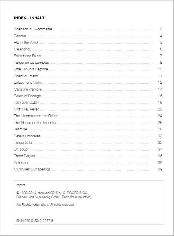 The 22 most popular Guitar Pieces Chanson du Montmartre Désirée Hat in the Wind Melancholy Feierabend Blues Tango en las sombras Little Clown's Ragtime Chant du matin Lullaby for a Violin Canzone d'amore Ballad of Donegal Rain over Dublin Motorway Fever The Mermaid and the Fisher The Sheep on the Mountain Jasmine Satie's Umbrellas Tango solo Un soupir Thoor Ballylee Antonio Murmures (Whisperings)