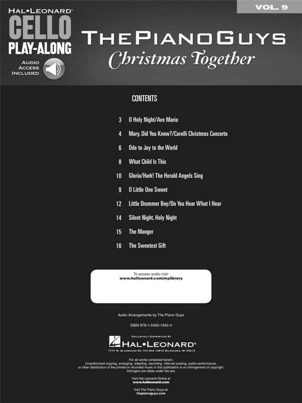The Cello Play-Along Series will help you play your favorite songs quickly and easily. Just follow the printed music and play along using the original backing tracks available online for download or streaming. This volume lets you play along with the Piano Guys! It contains ten selections from the Piano Guys' 2017 holiday album with original backing tracks created and recorded by the Piano Guys. The backing tracks are included in the price of this book. Ave Maria Corelli Christmas Concerto Do You Hear What I Hear Gloria Hark! The Herald Angels Sing Joy To The World Mary, Did You Know? O Holy Night O Little One Sweet Ode To Joy Silent Night, Holy Night The Little Drummer Boy The Manger The Sweetest Gift What Child Is This