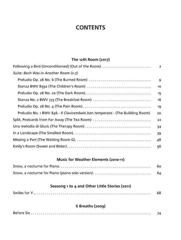 A brand new collection of solo piano pieces by Ezio Bosso from the album The 12th Room, which combines original compositions with famous pages by Bach and Chopin, revisited by Ezio and included in the suite Bach Was in Another Room (2-7), and by John Cage with In a Landscape. The collection is completed by three pieces belonging to three other projects: Six Breaths (2009), Music For Weather Elements (2010-11), Seasong 1 to 4 and Other Little Stories (2011).