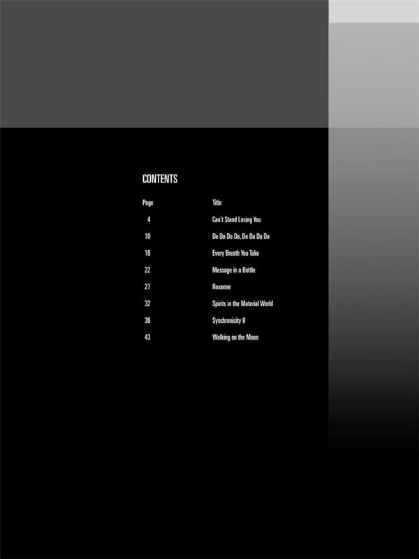 Play 8 Songs with Tab and Sound-alike CD Tracks Can't stand losing You De do do do de do da da da Every Breath You take Message in a Bottle Roxanne Spirits in the Material World Synchronicity II Walking on the Moon