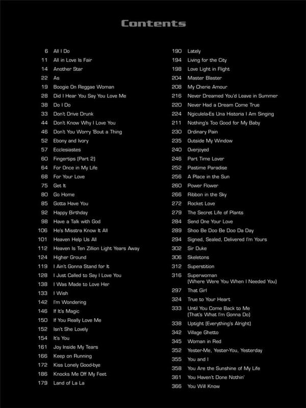 All I Do All In Love Is Fair Another Star As Boogie On Reggae Woman Did I Hear You Say You Love Me Do I Do Don't Drive Drunk Don't Know Why I Love You Don't You Worry 'Bout A Thing Ebony And Ivory Ecclesiastes Fingertips (Part 2) For Once In My Life For Your Love Get It Go Home Gotta Have You Happy Birthday Have A Talk With God He's Misstra Know It All Heaven Help Us All Heaven Is Ten Zillion Light Years Away Higher Ground I Ain't Gonna Stand For It I Just Called To Say I Love You I Was Made To Love Her I Wish I'm Wondering If It's Magic If You Really Love Me Isn't She Lovely It's You Joy Inside My Tears Keep On Running Kiss Lonely Good-bye Knocks Me Off My Feet Land Of La La Lately Living For The City Love Light In Flight Master Blaster My Cherie Amour Never Dreamed You'd Leave In Summer Never Had A Dream Come True Ngiculela-Es Una Historia I Am Singing Nothing's Too Good For My Baby Ordinary Pain Outside My Window Overjoyed Part Time Lover Pastime Paradise A Place In The Sun Power Flower Ribbon In The Sky Rocket Love The Secret Life Of Plants Send One Your Love Shoo Be Doo Be Doo Da Day Signed, Sealed, Delivered I'm Yours Sir Duke Skeletons Superstition Superwoman (Where Were You When I Needed You) That Girl True To Your Heart (from Walt Disney Pictures' MULAN) Until You Come Back To Me (That's What I'm Gonna Do) Uptight (Everything's Alright) Village Ghetto Woman In Red Yester-Me, Yester-You, Yesterday You And I You Are The Sunshine Of My Life You Haven't Done Nothin' You Will Know