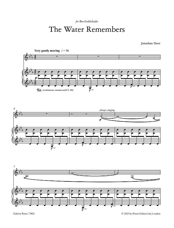 The water remembers is an answer to the question that begins Fred Chappell?s poem Narcissus and Echo: Shall the water not remember my hand?s slow gesture?? In Ovid?s Metamorphoses, Narcissus is famed for his beauty and falls in love with his own reflection in a pool of water. Each of the horn?s phrases is mirrored by its own reflection, subtly varied by the water?s ripples.