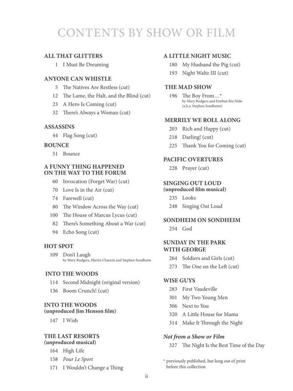 Boom Crunch (cut from Into The Woods) Bounce (Bounce) The Boy From... (The Mad Show) Darling (Merrily We Roll Along) Don't Laugh (Hot Spot) Echo Song (A Funny Thing Happened On The Way To The Forum) Farewell (A Funny Thing Happened On The Way To The Forum) First Vaudeville (from the 1998 reading Wise Guys) Flag Song (cut from Assassins) God (Sondheim On Sondheim) A Hero Is Coming (cut from Anyone Can Whistle) High Life (from the unproduced musical The Last Resorts) The House Of Marcus Lycus (A Funny Thing Happened On The Way To The Forum) I Must Be Dreaming (All That Glitters) I Wish (from the unproduced Jim Henson film Into The Woods) I Wouldn't Change A Thing (from the unproduced musical The Last Resorts) Invocation (Forget War) (cut from A Funny Thing Happened On The Way To The Forum) The Lame, The Halt, And The Blind (cut from Anyone Can Whistle) A Little House For Mama (from Wise Guys) Looks (from the unproduced film musical Singing Out Loud) Love Is In The Air (cut from A Funny Thing Happened On The Way To The Forum) Make It Through The Night (from Wise Guys) My Husband The Pig (cut from A Little Night Music) My Two Young Men (from Wise Guys) The Natives Are Restless (cut from Anyone Can Whistle) Next To You (from Wise Guys) The Night Is The Best Time Of The Day Night Waltz III (cut from A Little Night Music) The One On The Left (cut from Sunday In The Park With George) Pour Le Sport (from the unproduced musical The Last Resorts) Prayers (cut from Pacific Overtures) Rich And Happy (cut from Merrily We Roll Along) Second Midnight (Original Version) (cut from Into The Woods) Singing Out Loud (from the unproduced film musical Singing Out Loud) Soldiers And Girls (cut from Sunday In The Park With George) Thank You For Coming (cut from Merrily We Roll Along) There's Always A Woman (cut from Anyone Can Whistle) There's Something About A War (cut from A Funny Thing Happened On The Way To The Forum) Window Across The Way (cut from A Funny Thing Happened On The Way To The Forum)