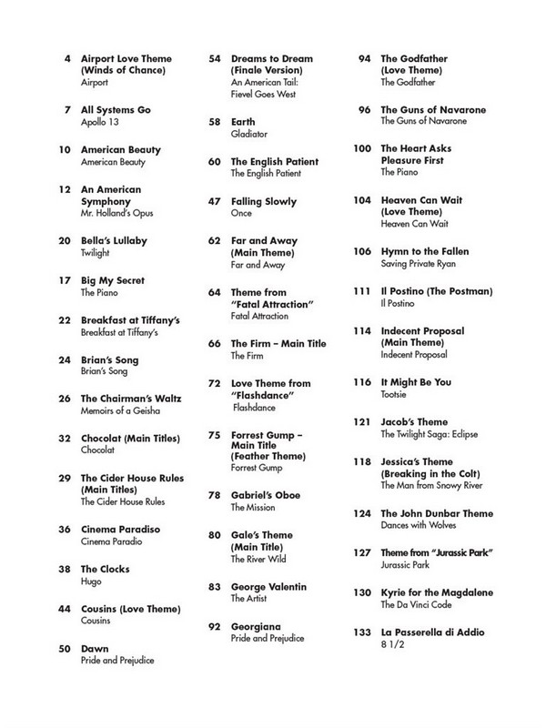 80 cinematic Favorites Airport Love Theme (Winds Of Chance) (from AIRPORT) All Systems Go (from APOLLO 13) American Beauty (from AMERICAN BEAUTY) An American Symphony (from MR. HOLLAND'S OPUS) Bella's Lullaby (from the Summit Entertainment film TWILIGHT) Big My Secret (from THE PIANO) Breakfast At Tiffany's (Theme from the Paramount Picture BREAKFAST AT TIFFANY'S) Brian's Song (Theme from the Screen Gems Television Production BRIAN'S SONG) The Chairman's Waltz (from MEMOIRS OF A GEISHA) Chocolat (Main Titles) (from the Motion Picture CHOCOLAT) The Cider House Rules (Main Titles) (from the Miramax Motion Picture THE CIDER HOUSE RULES) Cinema Paradiso (from CINEMA PARADISO) The Clocks (from the Paramount Motion Picture HUGO) Cousins (Love Theme) (from the Paramount Picture COUSINS) Dawn (from PRIDE AND PREJUDICE) Dreams To Dream (Finale Version) (from the Universal Motion Picture AN AMERICAN TAIL: FIEVEL GOES WEST) Earth (from the DreamWorks film GLADIATOR) The English Patient (from THE ENGLISH PATIENT) Falling Slowly (from the Motion Picture ONCE) Far And Away (Main Theme) (from the Universal Motion Picture FAR AND AWAY) Theme From Fatal Attraction (from the Paramount Motion Picture FATAL ATTRACTION) The Firm - Main Title (from the Paramount Motion Picture THE FIRM) Love Theme From Flashdance (from the Paramount Picture FLASHDANCE) Forrest Gump - Main Title (Feather Theme) (from the Paramount Motion Picture FORREST GUMP) Gabriel's Oboe (from the Motion Picture THE MISSION) Gale's Theme (Main Title) (from THE RIVER WILD) George Valentin (from the Motion Picture THE ARTIST) Georgiana (from PRIDE AND PREJUDICE) The Godfather (Love Theme) (from the Paramount Picture THE GODFATHER) The Guns Of Navarone (from THE GUNS OF NAVARONE) The Heart Asks Pleasure First (from THE PIANO) Heaven Can Wait (Love Theme) (from the Paramount Motion Picture HEAVEN CAN WAIT) Hymn To The Fallen (from the Paramount and DreamWorks Motion Picture SAVING PRIVATE RYAN) Il Postino (The Postman) (from IL POSTINO) Indecent Proposal (Main Theme) (from INDECENT PROPOSAL) It Might Be You (Theme from TOOTSIE) Jacob's Theme (from the Summit Entertainment film THE TWILIGHT SAGA: ECLIPSE) Jessica's Theme (Breaking In The Colt) (from THE MAN FROM SNOWY RIVER) The John Dunbar Theme (from DANCES WITH WOLVES) Theme From Jurassic Park (from the Universal Motion Picture JURASSIC PARK) Kyrie For The Magdalene (from THE DA VINCI CODE) La Passerella Di Addio (Theme from the film 8 1/2) La Valse D'Amelie (from AMELIE) Last Of The Mohicans (Main Theme) (from the Twentieth Century Fox Motion Picture THE LAST OF THE MOHICANS) Theme From Lawrence Of Arabia (from LAWRENCE OF ARABIA) A Love Before Time (from the Motion Picture CROUCHING TIGER, HIDDEN DRAGON) Love Story (Theme from the Paramount Picture LOVE STORY) The Ludlows (from TriStar Pictures' LEGENDS OF THE FALL) Maestro (from THE HOLIDAY) The Man From Snowy River (Main Title Theme) (from THE MAN FROM SNOWY RIVER) More (Ti Guarderò Nel Cuore) (from the film MONDO CANE) My Father's Favorite (from SENSE AND SENSIBILITY) The Naked Gun From The Files Of Police Squad! (Theme from the Paramount Picture THE NAKED GUN FROM THE FILES OF POLICE S) Neverland - Piano Variations In Blue (from FINDING NEVERLAND) Nicholas And Alexandra (Theme from NICHOLAS AND ALEXANDRA) Now We Are Free (from the DreamWorks film GLADIATOR) On Golden Pond (Main Theme from ON GOLDEN POND) Picnic (from the Columbia Technicolor Picture PICNIC) A Prayer For Peace (from MUNICH) The Promise (I'll Never Say Goodbye) (Theme from the Universal Motion Picture THE PROMISE) Raiders March (from RAIDERS OF THE LOST ARK) Ratatouille Main Theme (from Walt Disney Pictures' RATATOUILLE - A Pixar Film) Remembering Emilie, And Finale (from the Motion Picture WAR HORSE) River (from the Motion Picture THE MISSION) Riverside Walk (from WHILE YOU WERE SLEEPING) Road To Perdition (from the Motion Picture ROAD TO PERDITION) Theme From Sabrina (from the Paramount Motion Picture SABRINA) Sayuri's Theme (from MEMOIRS OF A GEISHA) Theme From Schindler's List (from the Universal Motion Picture SCHINDLER'S LIST) The Seduction (Love Theme) (from the Paramount Motion Picture AMERICAN GIGOLO) Somewhere In Time (from SOMEWHERE IN TIME) Spartacus - Love Theme (from the Universal-International Picture Release SPARTACUS) Star Wars (Main Theme) (from STAR WARS(R): EPISODE IV - A NEW HOPE) Theme From Summer Of '42 (The Summer Knows) (Theme from SUMMER OF '42) (Theme From) A Summer Place (from A SUMMER PLACE) Theme From Terms Of Endearment (from the Paramount Picture TERMS OF ENDEARMENT) Test Drive (from the Motion Picture HOW TO TRAIN YOUR DRAGON) Tubular Bells (Theme from THE EXORCIST) Waltz For Peppy (from the Motion Picture THE ARTIST) The Wings (from BROKEBACK MOUNTAIN)