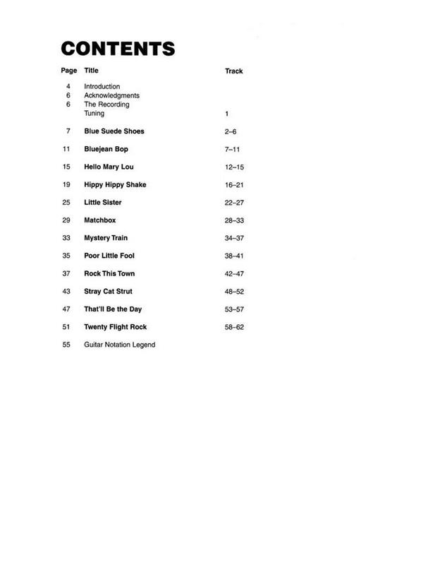 a step-by-step breakdown of the guitar styles and techniques of the rockabilly greats Blue suiede shoes (Carl Perkins) Bluejean bop (Gene Vincent and his blue caps) Hello Mary Lou (Ricky Nelson) Hippy hippy shake (The swinging Blue jeans) Little sister (Elvis Presley) Matchbox (Carl Perkins) Mystery train (Elvis Presley) Poor little fool (Ricky Nelson) Rock this town (The Stray Cats) Stray cat strut (The Stray Cats) That'll be the day (The Crickets) Twenty flight rock (Eddie Cochran)