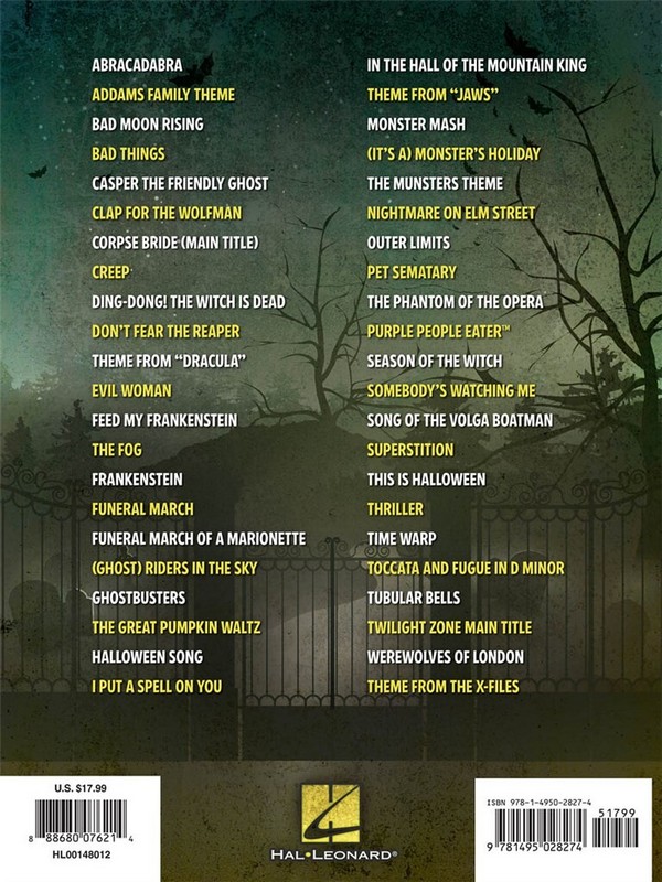 44 spooky Tunes Abracadabra Addams Family Theme Bad Moon Rising Bad Things Casper The Friendly Ghost Clap For The Wolfman Corpse Bride (Main Title) Creep Ding-Dong! The Witch Is Dead Don't Fear The Reaper Theme from Dracula Evil Woman Feed My Frankenstein The Fog Frankenstein Funeral March Funeral March Of A Marionette Ghostbusters The Great Pumpkin Waltz Halloween Song I Put A Spell On You In The Hall Of The Mountain King (It's A) Monster's Holiday Theme From Jaws Monster Mash The Munsters Theme Nightmare On Elm Street Outer Limits Pet Sematary The Phantom Of The Opera Purple People Eater(TM) (Ghost) Riders In The Sky (A Cowboy Legend) Season Of The Witch Somebody's Watching Me Song Of The Volga Boatman Superstition This Is Halloween Thriller Time Warp Toccata And Fugue In D Minor Tubular Bells Twilight Zone Main Title Werewolves Of London Theme From The X-Files