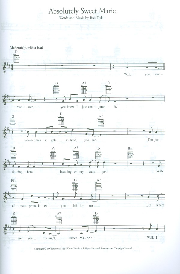 over 325 Songs 10,000 Men 2x2 4th Time Around A Hard Rain's A-gonna Fall Abandoned Love Absolutely Sweet Marie Ain't Gonna Grieve Alberta #1 Alberta #2 All Along The Watchower All I Really Want To Do All The Tired Horses Apple Suckling Tree Are You Ready? Arthur McBride As I Went Out One Morning Baby, I'm In The Mood For You Baby, Stop Crying Ballad In Plain D Ballad Of A Thin Man Ballad Of Hollis Brown Belle Isle Billy Black Crow Blues Black Diamond Bay Blackjack Davey Blood In My Eyes Blowin' In The Wind Bob Dylan's 115th Dream Bob Dylan's Blues Bob Dylan's Dream Boots Of Spanish Leather Born In Time Broke Down Engine Brownsville Girl Buckets Of Rain Canadee-i-o Can't Wait Catfish Cat's In The Well Changing Of The Guards Chimes Of Freedom Clean-cut Kid Clothes Line Cold Irons Bound Corrina, Corrina Country Pie Covenant Woman Dark Eyes Day Of The Locusts Dead Man, Dead Man Dear Landlord Death Is Not The End Delia Desolation Row Diamond Joe Dignity Dirge Dirt Road Blues Disease Of Conceit Do Right To Me, Baby Don't Fall Apart On Me Tonight Don't Think Twice, It's Alright Don't Ya Tell Henry Down Along The Cove Down In The Flood Down The Highway Drifter's Escape Driftin' Too Far From Shore Emotionally Yours Eternal Circle Every Grain Of Sand Everything Is Broken Falling From The Sky Farewell Farewell Angelina Father Of Night Foot Of Pride Forever Young Frankie And Albert Froggie Went A-courtin' From A Buick 6 Gates Of Eden George Jackson Get Your Rocks Off Girl Of The North Country God Knows Goin' To Acapulco Going, Going, Gone Golden Loom Gonna Change My Way Of Thinking Got My Mind Made Up Gotta Serve Somebody Guess I'm Doin' Fine Gypsy Lou Had A Dream About You, Baby Handy Dandy Hard Times Hazel Heart Of Mine Hero Blues Highlands Highway 61 Revisited Honey, Just Allow Me One More Chance Hurricane I Am A Lonesome Hobo I And I I Believe In You I Don't Believe You I Dreamed I Saw St. Augustine I Pity The Poor Immigrant I Shall Be Free I Shall Be Released I Threw It All Away I Wanna Be Your Lover I Want You I'd Hate To Be You On That Dreadful Day I'd Have You Anytime Idiot Wind If Dogs Run Free If Not For You If You See Her, Say Hello I'll Be Your Baby Tonight I'll Keep It With Mine I'll Remember You In Search Of Little Sadie In The Garden In The Summertime Is Your Love In Vain? Isis It Ain't Me Babe It Takes A Lot To Laugh, It Takes A Train To Cry It's All Over Now, Baby Blue It's Alright Ma (I'm Only Bleeding) Jack-A-Roe Jim Jones Joey John Brown John Wesley Harding Jokerman Just Like A Woman Just Like Tom Thumb's Blues Knockin' On Heaven's Door Lay Down Your Weary Tune Lay Lady Lay Lenny Bruce Leopard-skin Pillbox Hat Let Me Die In My Footsteps License To Kill Like A Rolling Stone View Lily, Rosemary And The Jack Of Hearts Little Maggie Living The Blues Lone Pilgrim Long Ago, Far Away Long Time Gone Long-distance Operator Love Henry Love Minus Zero/No Limit Love Sick Low And Behold! Maggie's Farm Make You Feel My Love Mama, You Been On My Mind Man Gave Names To All The Animals Man In The Long Black Coat Man Of Peace Masters Of War Maybe Someday Meet Me In The Morning Million Dollar Bash Million Miles Minstrel Boy Mixed Up Confusion Money Blues Most Likely You Go Your Way And I'll Go Mine Most Of The Time Motorpsycho Nightmare Mozambique Mr Tambourine Man My Back Pages Neighborhood Bully Never Gonna Be The Same Again Never Say Goodbye New Morning New Pony No Time To Think Nobody 'cept You North Country Blues Not Dark Yet Nothing Was Delivered Obviously Five Believers Odds And Ends Oh, Sister On A Night Like This On The Road Again One More Cup Of Coffee (Valley Below) One More Night One More Weekend One Of Us Must Know (Sooner Or Later) One Too Many Mornings Only A Hobo Only A Pawn In Their Game Open The Door, Homer Outlaw Blues Oxford Town Paths Of Victory Peggy Day Percy's Song Playboys And Playgirls Please, Mrs Henry Pledging My Time Political World Positively 4th Street Precious Angel Precious Memories Pressing On Property Of Jesus Queen Jane Approximately Quinn The Eskimo (The Mighty Quinn) Quit Your Lowdown Ways Ragged And Dirty Rainy Day Women #12 & 35 Restless Farewell Ring Them Bells Rita May Rocks And Gravel Romance In Durango Sad-eyed Lady Of The Lowlands Sarah Saved Saving Grace Seeing The Real You At Last Senor (Tales Of Yankee Power) Series Of Dreams Seven Curses Seven Days She Belongs To Me Shelter From The Storm Shenandoah She's Your Lover Now Shooting Star Shot Of Love Sign On The Window Silent Weekend Silvio Simple Twist Of Fate Sittin' On Top Of The World Slow Train Solid Rock Something There Is About You Song To Woody Spanish Harlem Incident Stack A Lee Standing In The Doorway Step It Up And Go Stuck Inside Of Mobile With The Memphis Blues Again Subterranean Homesick Blues Sweetheart Like You T.V. Talking' Song Talkin' World War III Blues Tangled Up In Blue Tears Of A Rage Tell Me That It Isn't True Tell Me, Momma Temporary Like Achilles The Ballad Of Frankie Lee And Judas Priest The Death Of Emmett Till The Groom's Still Waiting At The Altar The Lonesome Death Of Hattie Carroll The Man In Me The Times They Are A Changing The Wicked Messenger Things Have Changed This Wheel's On Fire Three Angels Tight Connection To My Heart Till Fell In Love With You Time Passes Slowly To Be Alone With You To Ramona Tombstone Blues Tomorrow Is A Long Time Tonight I'll Be Staying Here With You Too Much Of Nothing Tough Mama Trouble True Love Tends To Forget Trust Yourself Tryin' To Get To Heaven Two Soldiers Ugliest Girl In World Unbelievable Under The Red Sky Under Your Spell Union Sundown Up To Me Visions Of Johama Walkin' Down The Line Wallflower Walls Of Red Wing Wanted Man Watching The River Flow Watered-down Love We Better Talk This Over Wedding Song Went To See The Gypsy What Can I Do For You? What Good Am I? What Was It You Wanted? Whatcha Gonna Do When He Returns When I Paint My Masterpiece When The Night Comes Falling From The Sky When The Ship Comes In When You Gonna Wake Up W