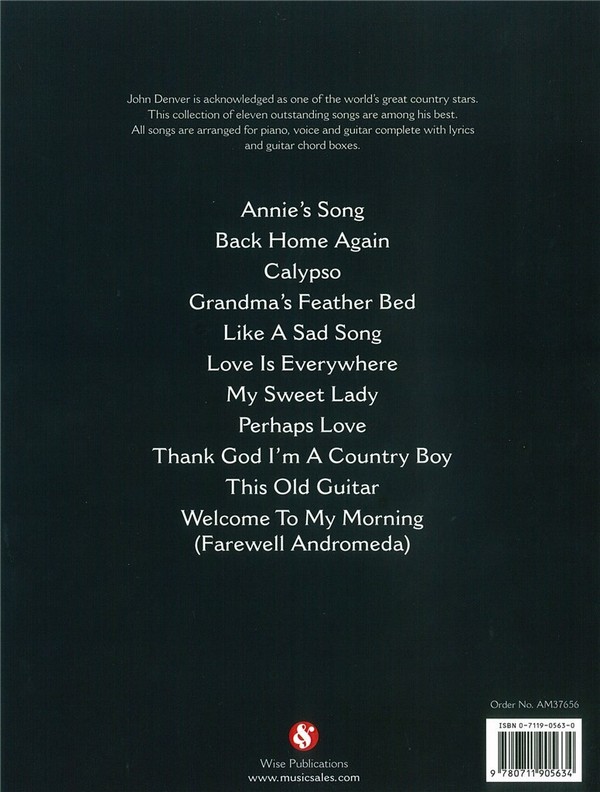 ANNIE'S SONG BACK HOME AGAIN CALYPSO GRANDMA'S FEATHER BED LOVE IS EVERYWHERE LIKE A SAD SONG MY SWEET LADY PERHAPS LOVE THANK GOD I'M A COUNTRY BOY THIS OLD GUITAR WELCOME TO MY MORNING