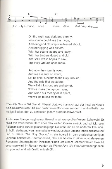 Irische Folksongs Steinbach, Patrick, bearb. The holy Ground Will you come to the Bower Bunclody The leaving of Liverpool Skibbereen Mrs McGrath The Nightingale The riddle Song The Beggarman's Song The Sea around us The Blacksmith She moved through the Fair Mary from Dungloe Carrickfergus The Star of the County down Still I love him Hush little Baby The Curragh of Kildare Master McGrath The Rose of Tralee Lonely Banna Strand The Bold Fenian Men Old Woman from Wexford I never will marry The Cliffs of Dooneen I'm a rover and seldom sober As I roved out The Butcher Boy Maids when you're young The West's awake God save Ireland Spancil Hill Paddy works on the Railway Down by the Liffeyside Limerick is beautiful Kelly the Boy from Killanne The foggy Dew The Rose of Allendale Fiddler's Green Sweet Carnloch Bay The rising of the Moon The black Velvet Band The spanish Lady Dicey Riley