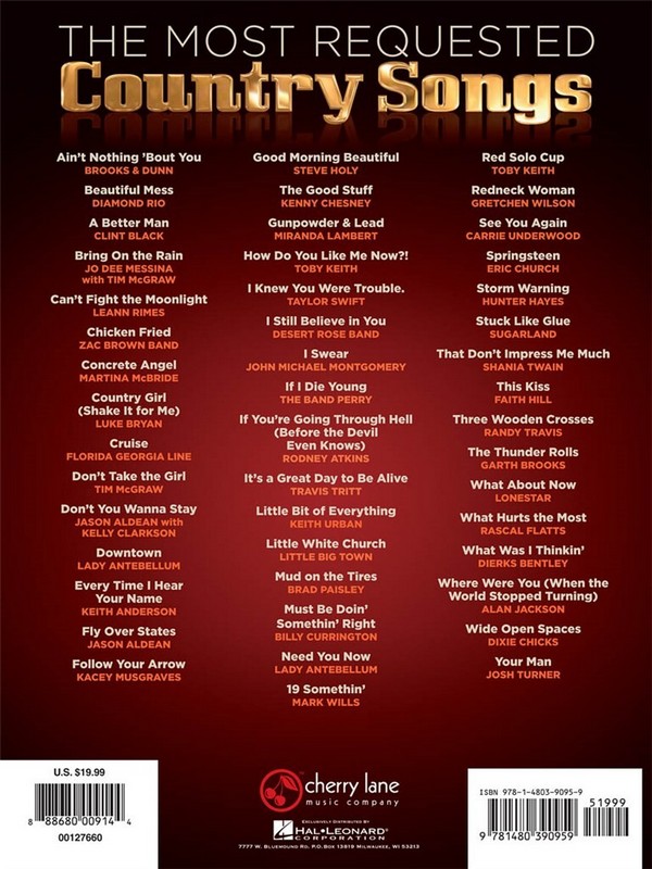 A comprehensive Collection of 47 Country Favorites Ain't Nothing 'Bout You Beautiful Mess A Better Man Bring On The Rain Can't Fight The Moonlight Chicken Fried Concrete Angel Country Girl (Shake It For Me) Cruise Don't Take The Girl Don't You Wanna Stay Downtown Every Time I Hear Your Name Fly Over States Follow Your Arrow Good Morning Beautiful The Good Stuff Gunpowder & Lead How Do You Like Me Now?! I Hope You Dance I Knew You Were Trouble I Still Believe In You I Swear If I Die Young If You're Going Through Hell (Before The Devil Even Knows) It's A Great Day To Be Alive Little Bit Of Everything Little White Church Mud On The Tires Must Be Doin' Somethin' Right Need You Now 19 Somethin' Red Red Solo Cup Redneck Woman See You Again Springsteen Stuck Like Glue That Don't Impress Me Much This Kiss Three Wooden Crosses The Thunder Rolls Wagon Wheel What About Now What Hurts The Most What Was I Thinkin' Where Were You (When The World Stopped Turning) Wide Open Spaces Your Man