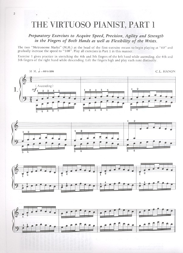 DER KLAVIERVIRTUOSE The most widely used piano technique book ever written, The Virtuoso Pianist was designed to develop agility and strength in all the fingers as well as flexibility of the wrists. Exercises are sequenced so that in each successive exercise, the fingers are rested from the fatigue caused by the previous one. Translated from the original French, this Masterwork edition includes the complete Exercises 1-60 and is clearly engraved for easy reading. Hanon's original introduction is included. He recommends that a student have at least one year of experience before starting this book. A General MIDI disk is available separately (Item #5715). The disk contains varied styles of accompaniments including pop, classical and jazz for Exercises 1-20.