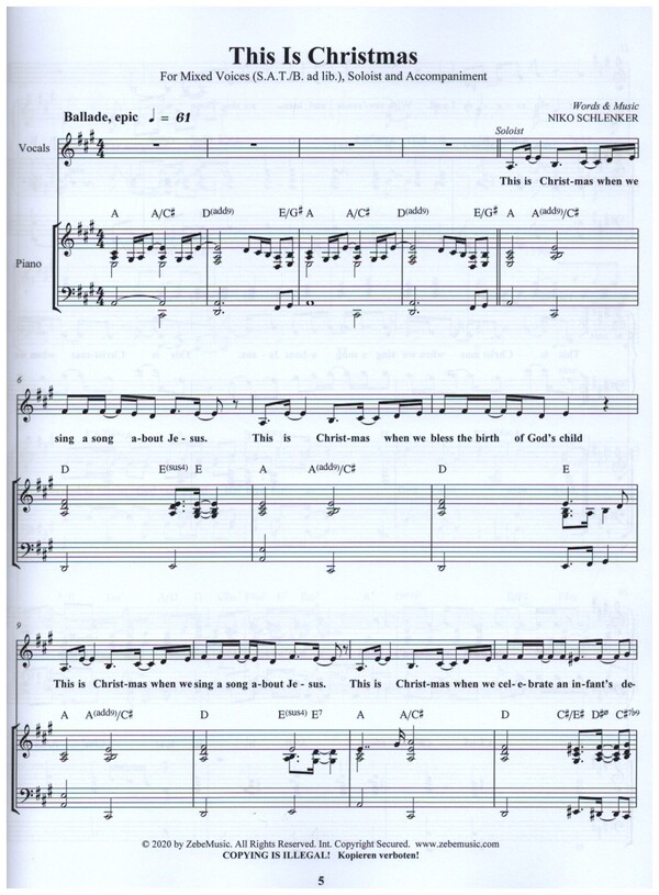 11 traditionelle und neue Songs für die Advents- und Weihnachtszeit in deutscher und englischer Sprache mittelschwer, im Gospel- und Jazzstil Christmas (Offering of Peace) Christmas-Medley (inkl. Joy to the World, Angels We Have Heard on High, Go Tell It on the Mountain) Lord I love Your Name Emmanuel This Is Christmas! The Light (Das Licht) Es ist ein Ros entsprungen Angels We Have Heard on High God Rest Ye Merry Gentlemen Kings of Orient (We Three Kings) Oh Heiland reiß die Himmel auf O Come All Ye Faithful Wasnt That a Mighty Day (War das nicht ein großer Tag)