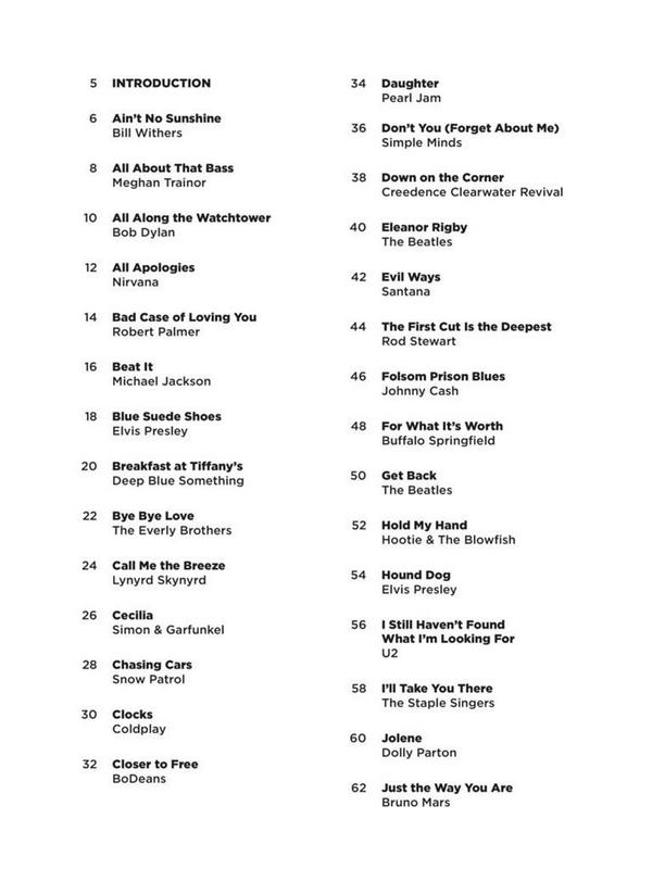 1. Ain't No Sunshine 2. All About That Bass 3. All Along The Watchtower 4. All Apologies 5. Bad Case Of Loving You 6. Beat It 7. Blue Suede Shoes 8. Breakfast At Tiffany's 9. Bye bye Love 10. Call Me The Breeze 11. Cecilia 12. Chasing Cars 13. Clocks 14. Closer To Free 15. Daughte 16. Don'T You (Forget About Me) 17. Down On The Corner 18. Eleanor Rigby 19. Evil Ways 20. Folsom Prison Blues 21. For What It's Worth 22. Get Back 23. Hold My Hand 24. Hound Dog 25. I Still Haven't Found What I'm Looking For 26. I'll Take You There 27. Jolene 28. Just the way you are 29. Kiss 30. La bamba 31. Last Train To Clarksville 32. Lay Down Sally 33. Lean On Me 34. Leaving on a Jet Plane 35. Lost Boy 36. Louie, Louie 37. Love Me Do 38. Me And Bobby McGee 39. Move It On Over 40. Mustang Sally 41. Old Time Rock & Roll 42. Ring Of Fire 43. Riptide 44. Route 66 45. Royals 46. Sad Songs (Say So Much) 47. Seven Bridges Road 48. Shake It Off 49. Singin' in the rain 50. Story Of My Life 51. Sugar, Sugar 52. Surfin' U.S.A. 53. Sweet Caroline 54. The First Cut Is The Deepest 55. The Music of the Night 56. This Land Is Your Land 57. Three Little Birds 58. Twist and Shout 59. Use Somebody 60. Walk of Life