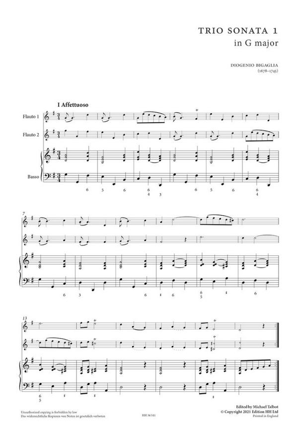 Trio sonatas by Italian composers from the period around 1730 that specify flutes for both upper parts are quite rare. Among the earliest known are these three concise four-movement sonatas of only moderate technical difficulty by the Venetian monk and proficient amateur composer Diogenio Bigaglia, who very likely wrote them to order for a German visitor to his city. They are delightful compositions, full of grace, euphony, wit and contrapuntal dexterity, and they also show great sensitivity towards the delicate sound of the baroque transverse flute (traverso).