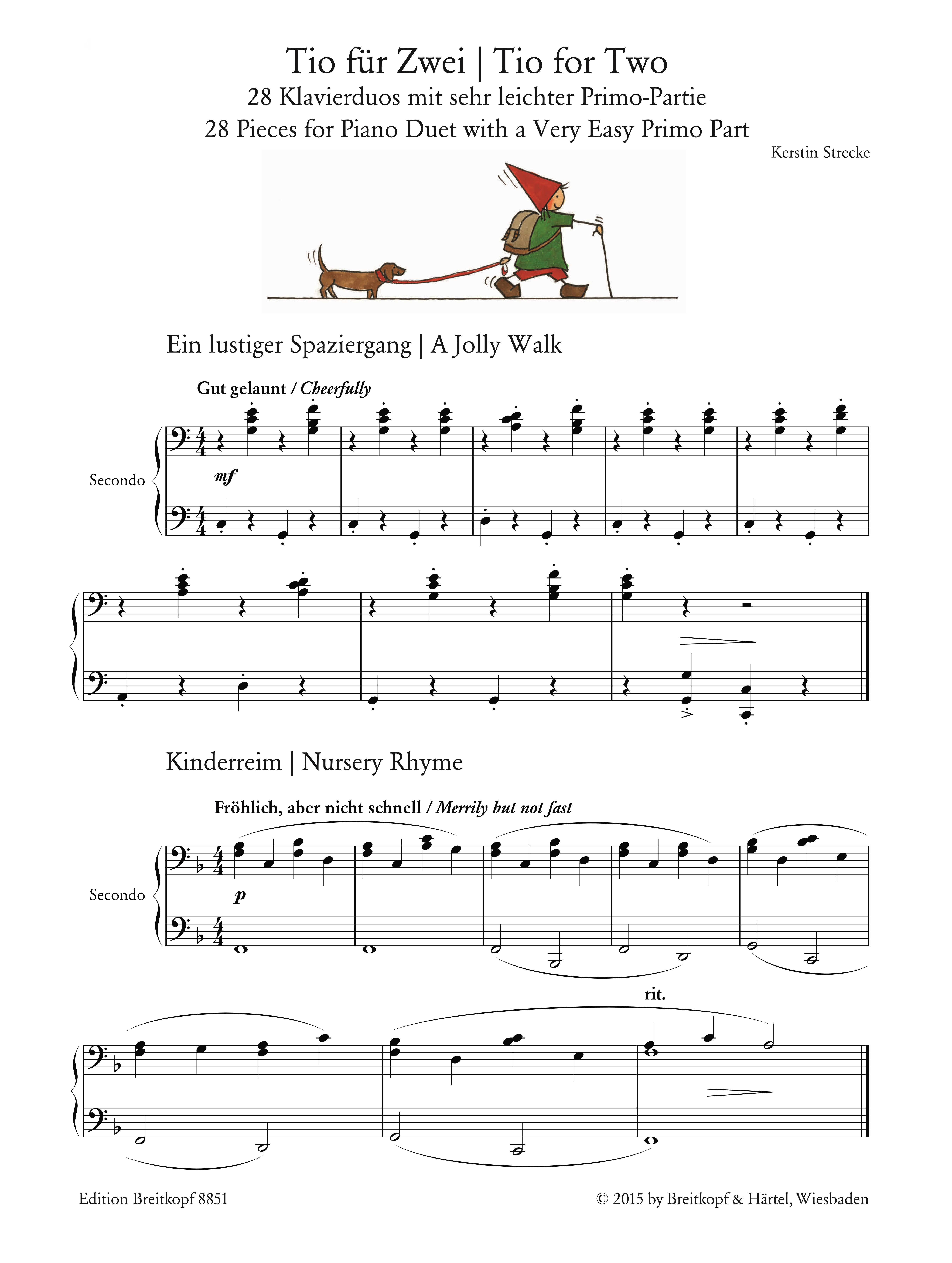 Tio für Zwei ist die ideale Ergänzung zu Tio das Tastenmännchen. Die bildhaften musikalischen Miniaturen laden zum ersten vierhändigen Spiel ein. Zur Weiterentwicklung spieltechnischer Grundlagen und Fertigkeiten empfiehlt sich Tio on Tour, und in Tio feiert Weihnachten finden sich sehr leichte und leichte Sätze zu Weihnachtsliedern aus verschiedenen Ländern. 28 Klavierduos mit sehr leichter Primo-Partie Ein lustiger Spaziergang Kinderreim Herbstregen Um die Wette hüpfen Gutenmorgenlied Der traurige Schneemann Mein braves Pferdchen Aquarium Ein alter Landstreicher Sommerwolken Großmutter erzählt Im Feenpalast Eine Vier in Mathe Das Vöglein Räuber und Gendarm Kleine Ballade Zwei kleine Hirten Ein Walzer Ein klappriges Fahrrad Pharaonenmelodie Frühlingswind Puppentheater Das neue Spielzeug Nachts auf dem Wasser Kleine Träumerei Spaß Pusteblumen Schlafliedchen