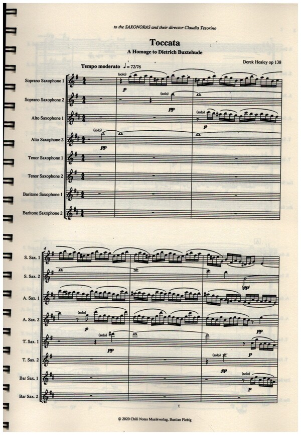Contemporary Tokkata Eine Hommage an Dietrich Buxtehude ist das zweite von zwei Stücken, die auf der Orgelmusik großer Komponisten des 17. Jahrhunderts basieren. Das erste Stück heißt Toccata per l'Elevatione, basierend auf der Musik von Frescobaldi, und wurde 2007 fertiggestellt. Healey hat seit 1952eine Vorliebe für die Musik von Buxtehude, als seine Eltern ihm ein Buch mit früher Orgelmusik kauften, das zwei Werke davon enthielt. Die Musik dieses norddeutschen Meisters zeichnet sich durch eine klare und lebendige Vorstellungskraft aus, die sich natürlich für eine moderne Ausarbeitung eignet (diese Eigenschaft findet sich auch in der deutschen Malerei aus dem Mittelalter und der frühen Renaissance). Es ist allgemein anerkannt, dass die Musik von Buxtehude für die frühe Entwicklung von J. S. Bach wichtig war. Diese Hommage an einen Satz besteht aus etwa 20 kurzen Abschnitten, von denen die meisten von Gesten und Motiven inspiriert sind, die aus Werken ausgewählt wurden, für die Healey seit langem eine Vorliebe hat, so etwa die Präludien und Fugen in fis-Moll, g-Moll, e-Moll und d-Moll sowie die Toccata in d-Moll. Healey verwendet dabei kein direktes Material aus Buxtehudes Werk, sondern nutzt seine Techniken als Ausgangspunkt. Die Motive sind von heute und verwenden Skalen und Techniken, die im 17. Jahrhundert nicht zu finden waren. Zum Beispiel hat Healey in den kurzen Semiquaver-Solo-Pedalpassagen (häufig in Buxtehudes Werken zu finden) Doppelungen in der Doppeloktave, der Oktave und der Zwölften verwendet, wie es ein Organist tun würde, aber Healey hat diese Registrierung innerhalb einer kurzen Phrase ständig geändert. Das Werk wurde von Claudia Tesorino für ihr Saxophonensemble SAXONORAS angefordert, kann aber auch auf einem Oktett gespielt werden. Es wurde 2014 komponiert, am 11. Juni fertiggestellt und am 6. November dieses Jahres in der Gedächtnis-Kirche in Berlin uraufgeführt