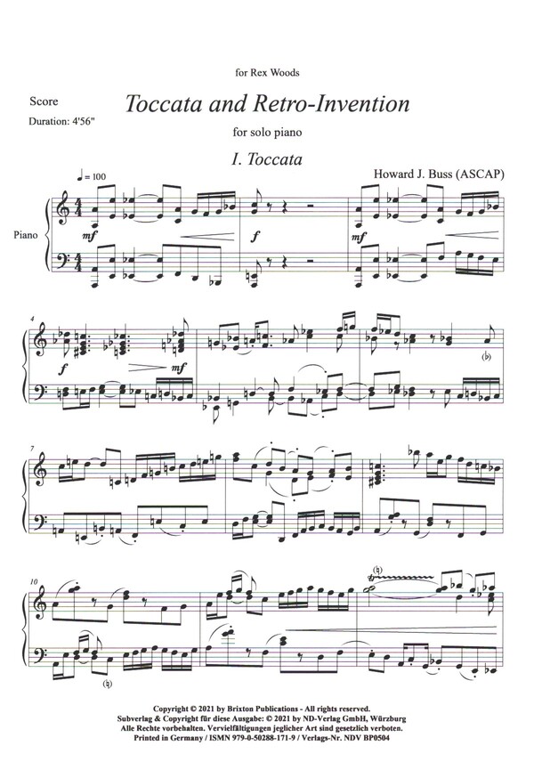 Toccata und Retro-Invention für Klavier solo von Howard J. Buss ist dem Klavierprofessor der Universität von Arizona, Rex Woods, gewidmet. Die Titel der beiden Sätze dieser Komposition sind verwandt mit den Toccaten und Inventionen der Barockzeit, jedoch mit einer modernen Wendung. Sie fangen den Geist der früheren Formen ein, nicht die tatsächlichen Kompositionsverfahren. Hinweise für den Interpreten: Diese Komposition ist ohne Tonartvorzeichen geschrieben. Wegen der häufigen chromatischen Verschiebungen, der bunten Akkordstrukturen mit gemischten Vorzeichen (z.B. in Takt 13) und der Querverbindungen werden im ganzen Stück großzügig Vorzeichen verwendet. Die Verwendung des Haltepedals wird an einigen Stellen ausdrücklich angegeben. Der Spieler kann es an anderen Stellen kurz und sparsam zu Ausdruckszwecken verwenden. Wenn über einem Zweiklang ein Triller angegeben ist, darf nur die oberste Note getriggert werden. Artikulationszeichen werden im gesamten Stück sparsam verwendet, um dem Spieler einen gewissen interpretatorischen Spielraum zu geben. Im Allgemeinen wird dem Pianisten empfohlen, eine etwas secco, losgelöste Artikulation zu verwenden. Toccata Dauer 4'56' Retro-Invention Dauer 3'43' Die Gesamtaufführungszeit beträgt mit einer kurzen Pause zwischen den Sätzen etwa 9 Minuten.