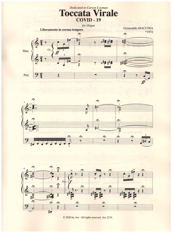 Der aktuellen Situation entsprechend hat der italienische Orgelvirtuose Grimoaldo Macchia eine dramatische Toccata komponiert. Die Toccata ist dem Organisten Carson Cooman gewidmet, der sie auf Youtube eingespielt hat.