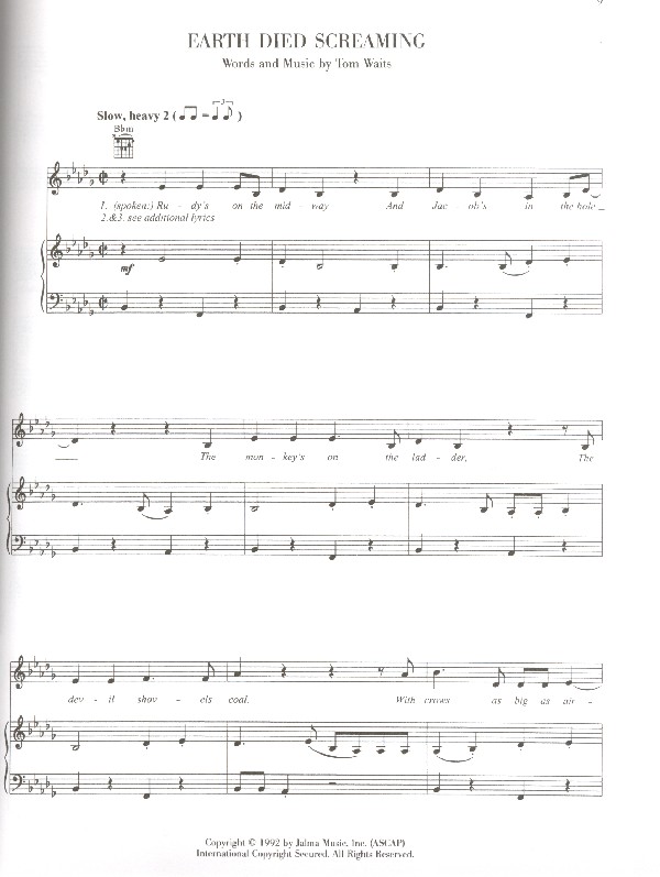 16 shells from a thirty-ought-six A little Rain Anywhere i lay my Head Back in the good old World Big black Mariah Black Wings The Briar and the Rose Cemetery Polka Cold cold Ground Dirt in the Ground Downtown Rrain Earth died screaming Fall of Troy Falling down Filipino Box Spring Hog Frank's wild Years Gun Street Girl Hang down your Head Hang on St. Christopher I don't wanna grow up Innocent when you dream I'll shoot the Moon I'll take New York Jesus gonna be here Jockey full of Bourbon Johnsburgh, Illinois The last Rose of Summer Lucky Day Murder in the red Barn November Rain Dogs Shore Leave Singapore Soldier's Things Straight to the Top (Vegas) Strange Weather Tango till they're sore Telephone call from Istanbul Temptation That Feel Time Train Song Underground Walk away Way down in the Hole Whistle down the Wind Who are you Yesterday is here