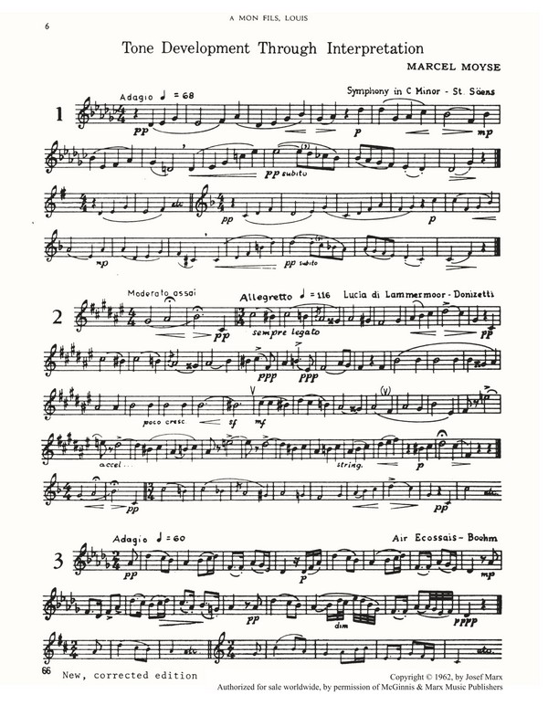 Der Flötist und Pädagoge Marcel Moyse hat in seinem Band Tone Development Through Interpretation 90 Übungsstücke zusammengestellt, die nach Lage, Dynamik und anderen musikalischen Kriterien geordnet sind. Es handelt sich dabei um Auszüge aus klassischem Lied- Opern- und Orchesterrepertoire ein unverzichtbares Hilfsmittel für Flötenschülerinnen und -schüler, das auch auf andere Blasinstrumente übertragbar ist. Das Repertoire enthält das nötige Rüstzeug, um jede interpretatorische Herausforderung mit der geeigneten Spieltechnik zu meistern. Im Anhang sind außerdem Klavierbegleitungen für neun längere Übungsstücke enthalten. Diese bei Flötistinnen und Flötisten äußerst begehrte Originalausgabe Tone Development Through Interpretation ist ab jetzt weltweit über Edition Peters in Zusammenarbeit mit McGinnis & Marx erhältlich. Marcel Moyse war Mitbegründer der Marlboro School of Music. Er unterrichtete unter anderem James Galway und Paula Robison. Die Sammlung Tone Development Through Interpretation verwendet Opernrepertoire zur Vermittlung eines kantablen Tons. Mehr als eine reine Methodik eine wahre Fundgrube für alle Einsatzmöglichkeiten