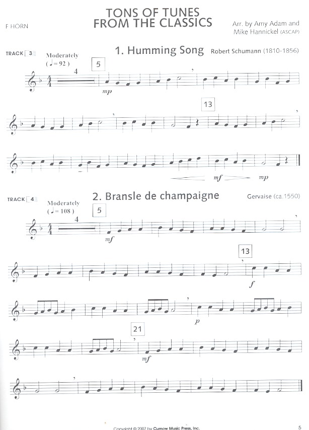 Humming song (Schumann) Musette (Bach) See the conquering hero comes (Händel) Fanfare (Corrette) Pathetique theme (Beethoven) Rondo alla turca (Mozart) Spring (Vivaldi) Scherzo (Clementi) Willhelm Tell (Rossini) Lullaby (Brahms) Funeral March (Chopin) Trumpet voluntary (Clarke) Largo from New world (Dvorak)