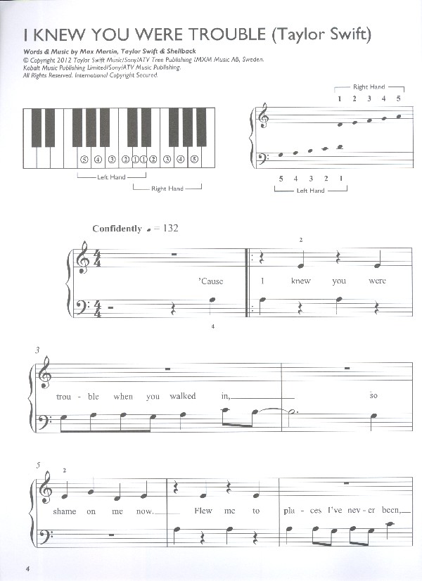 Easiest 5-Finger Piano Collection Best Song ever Brand new Day Burn Clown Dear Darlin' Flatline I knew You were Trouble Just give me a Reason Let her go Panic Cord Pompeii Right Place right Time Roar Walks like Rihanna What about us