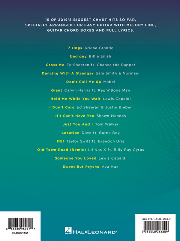 15 hot Singles 7 Rings Bad Guy Cross me Dancing with a Stranger Don't call me up Giant Hold me while You wait I don't care If I can't have You Just You and I Location Me Old Town Road (Remix) Someone You loved Sweet but psycho