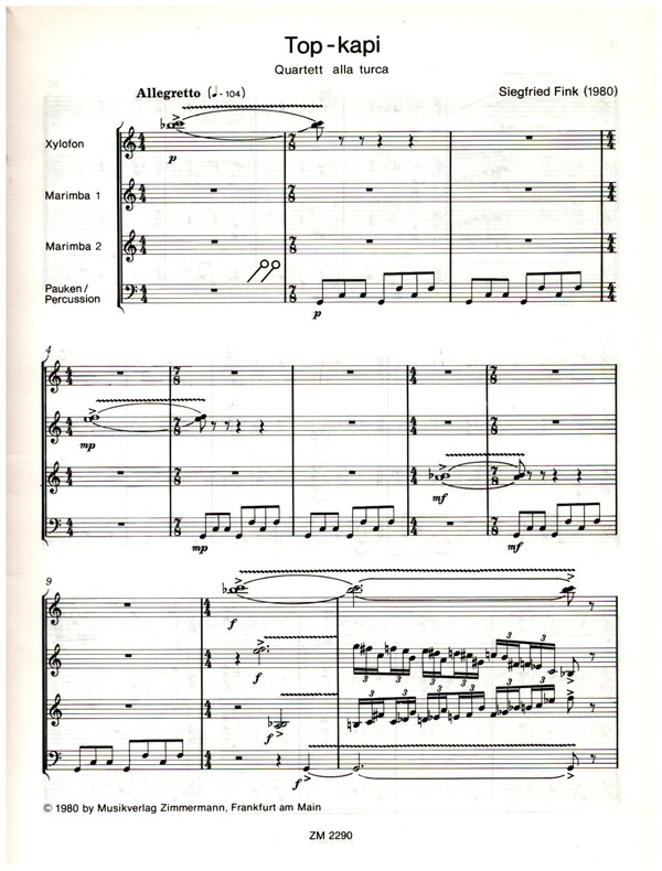 | Untertitel: | für Xylophon, 2 Marimbas und Percussion Partitur und Stimmen |